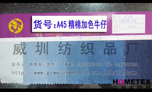 織物組織:平紋 幅寬:150cm 品名:純棉牛仔 密度:64*47 水洗工藝:砂洗 貨號:A45精棉加色 重量:* 具體用途:休閑服、工作服、褲裝、時(shí)裝 別名:A45精棉加色 印染工藝:印花 成分及含量:100%棉 主要用途:服裝用布 ======================================================================= 以上產(chǎn)品全部現貨供應,可隨時(shí)提供樣布卡和現貨,隨時(shí)發(fā)貨。所有產(chǎn)品全部是廠(chǎng)家直銷(xiāo)價(jià),我們承諾:以超低利潤營(yíng)銷(xiāo),我 們只求銷(xiāo)售量。為保證您的利益,我司建議您在采購前先確認我們的品質(zhì)樣與顏色樣后再拿大貨,期待與您的真誠合作。因產(chǎn) 品種類(lèi)較多,具體參考未盡詳盡,如有需要,請您與我們聯(lián)系。 瑞豐紡織(中大旗艦店)坐落于國內最大的紡織面料產(chǎn)業(yè)中心—廣州中大,是一家專(zhuān)業(yè)銷(xiāo)售面料的廠(chǎng)家直銷(xiāo)商。主要經(jīng) 營(yíng)產(chǎn)品有:全棉凈色、仿記憶絲面料、全棉(TC)色織等,面料品種花達上千余種,所有產(chǎn)品全部現貨經(jīng)營(yíng)。 我們面料的品質(zhì)來(lái)源于:1、采用國內外優(yōu)質(zhì)的原材料;2、使用精良的生產(chǎn)工藝和設備;3、完善的生產(chǎn)質(zhì)量管理體系。我 們具有開(kāi)發(fā)和創(chuàng )新品種的強烈意識和優(yōu)越條件,并根據客戶(hù)需求與市場(chǎng)變化時(shí)時(shí)推出潮流面料。憑著(zhù)多年的專(zhuān)業(yè)行業(yè)經(jīng)驗,根 據客戶(hù)需求,不論客戶(hù)在全國任何地方,只要提供小樣,就可在一兩天時(shí)間內輕松獲得所需面料的信息。 批發(fā)說(shuō)明供應商支持混批 。 ============================================================= 有意請加QQ:1295021910或電話(huà)聯(lián)系。 公司名稱(chēng):威圳紡織品廠(chǎng) 聯(lián)系人:陳修喜先生 手機:13650817858 網(wǎng)址:http://www.gzweizhen2010.cn.alibaba.com =============================================================