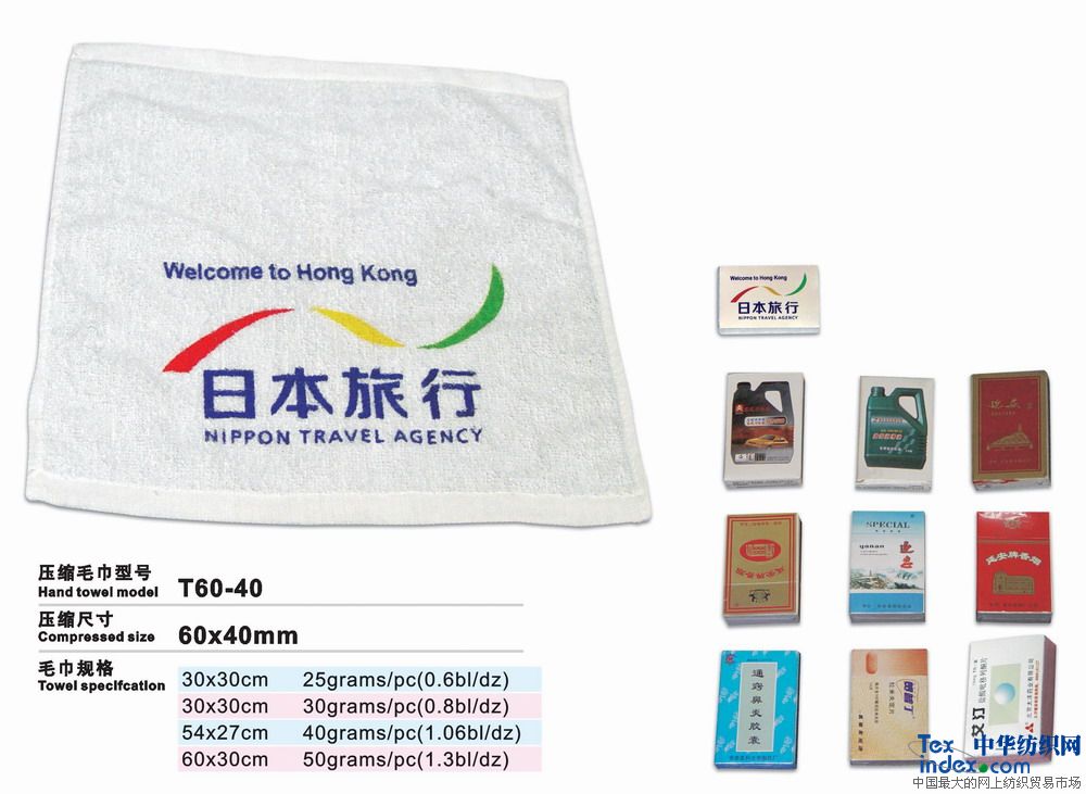 高級環(huán)保壓縮毛巾是二十一世紀的高科技成果、采用100%純棉經(jīng)高溫壓處理而成的新一代產(chǎn)品。放入水中浸片刻即可張開(kāi)使用。本產(chǎn)品新奇獨特,干凈衛生,產(chǎn)品企業(yè)形象宣傳極具效力。廣泛用于廣告宣傳界、酒店、旅游公司等。