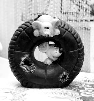 在大多數人的意識里,老鼠總是在黑暗、破爛的地方出現,比如輪胎就是老鼠比較愛(ài)呆的地方。這個(gè)小飾品就把老鼠這一最常見(jiàn)的狀態(tài)展現了出來(lái),兩只有點(diǎn)膽小的老鼠從輪胎里爬了出來(lái),剛露出了半截身子,眼珠子似乎在四處打轉,觀(guān)察周邊的環(huán)境。用樹(shù)脂材料制作的輪胎還挖了幾個(gè)洞,有一些破布露了出來(lái),形象極為逼真。原來(lái),這是一個(gè)存錢(qián)罐,輪胎的頂部是存錢(qián)的口,只是把錢(qián)存在老鼠的“大本營(yíng)”里,會(huì )不會(huì )安全呢?